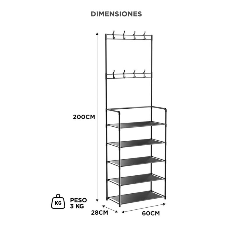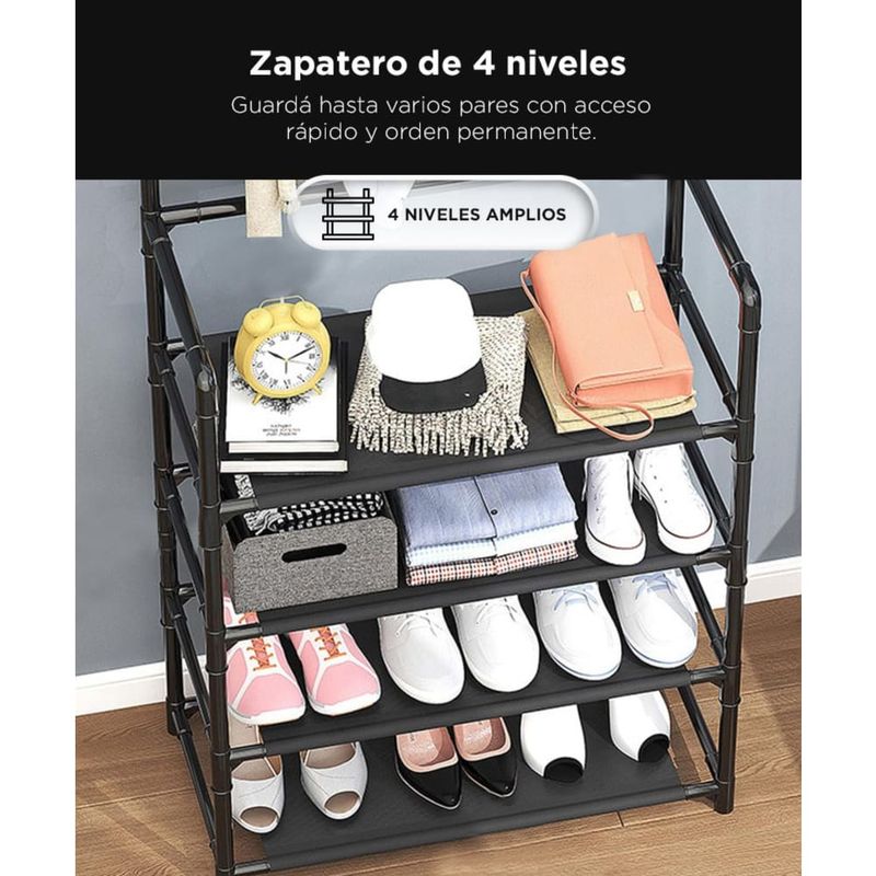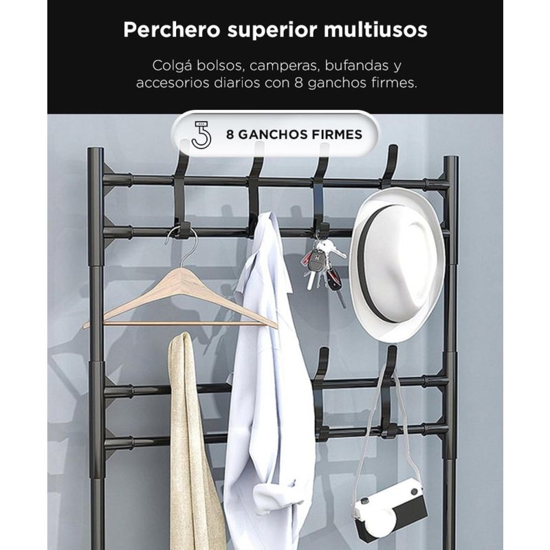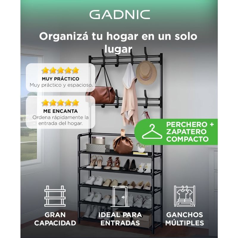 El Perchero Organizador Zapatero Gadnic combina un diseño práctico con una estructura firme para mantener todo en orden. Sus 4 niveles permiten almacenar calzado de forma cómoda y accesible mientras que el sector superior incluye barras y ganchos para ropa, bolsos, gorras y accesorios diarios. Ideal para entradas, dormitorios o vestidores.