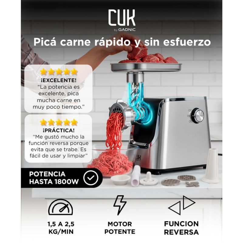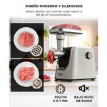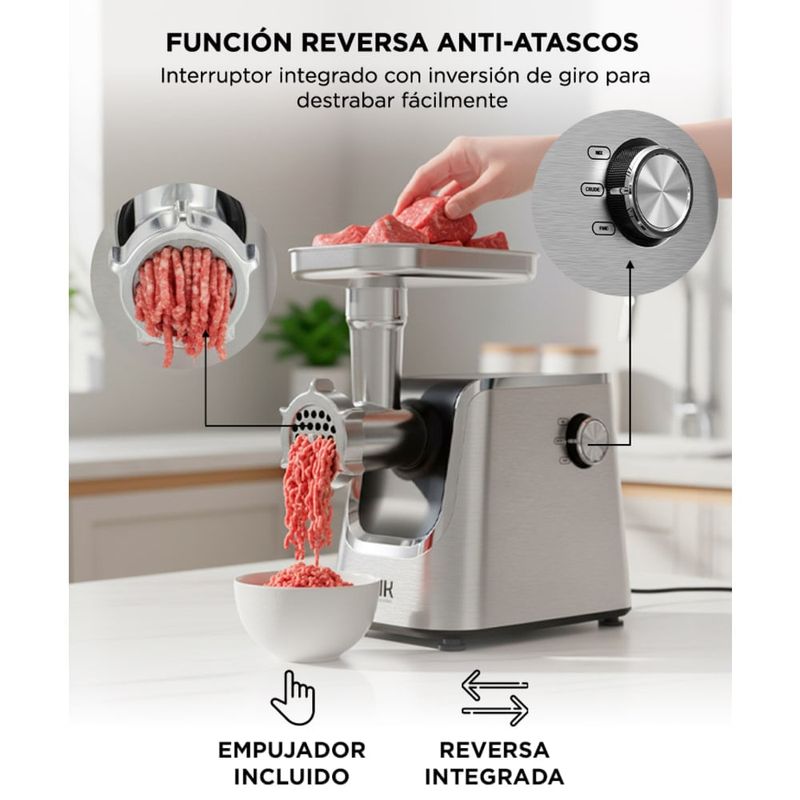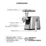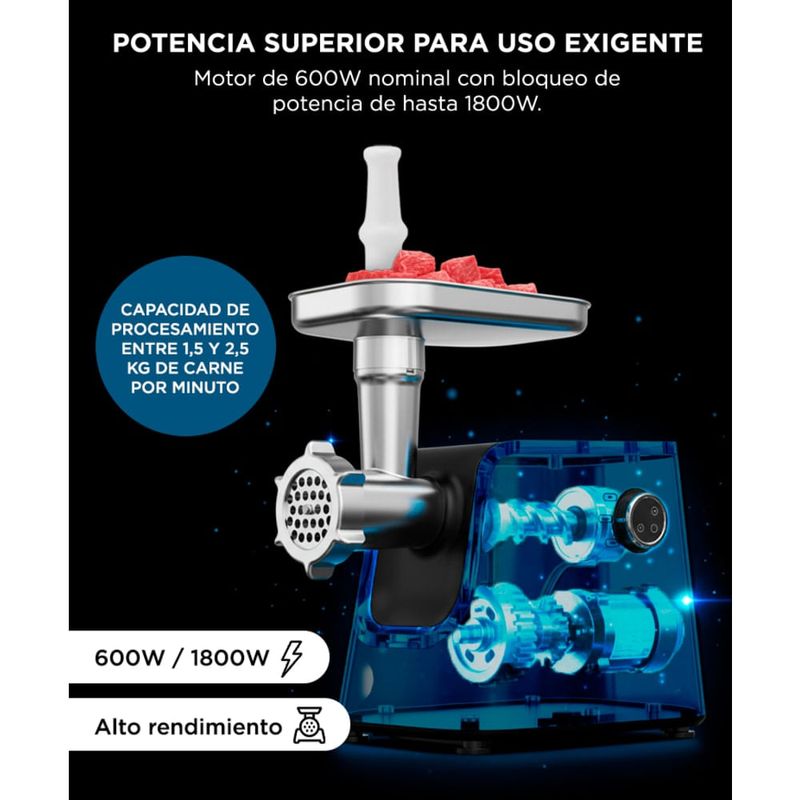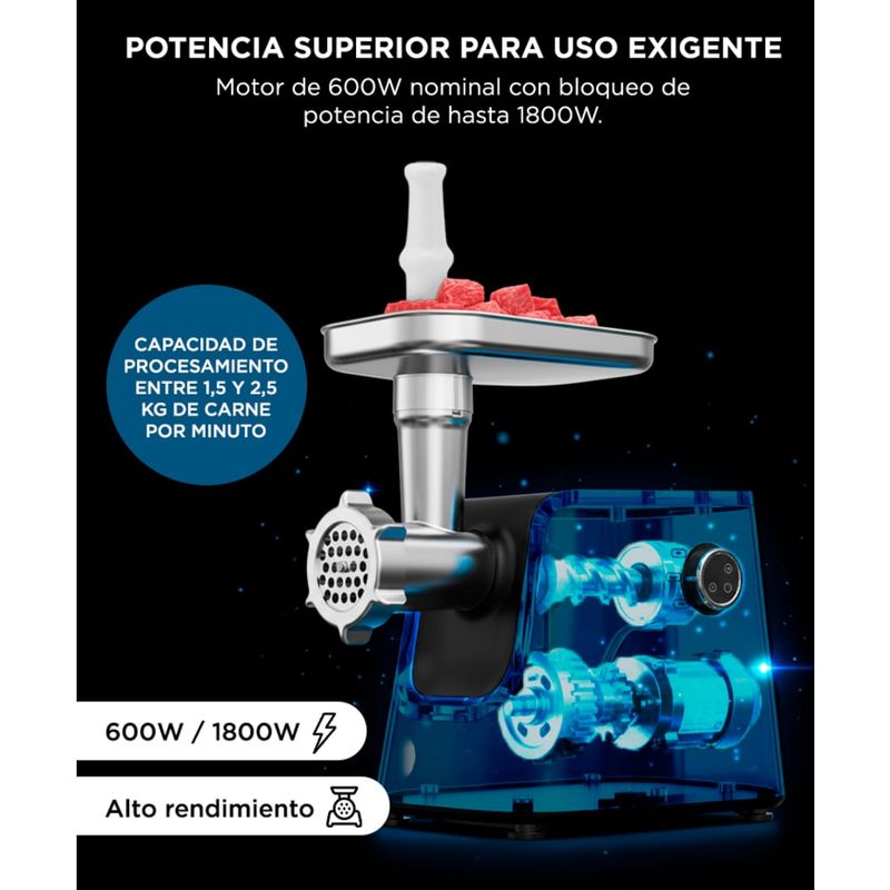 Cuenta con 600W nominales y bloqueo de potencia de hasta 1800W, ofreciendo un funcionamiento estable incluso con carnes más exigentes.