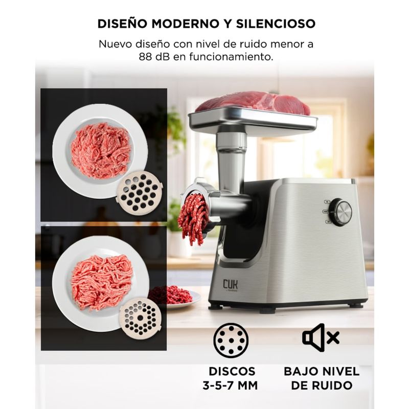 Incluye discos de 3 mm, 5 mm y 7 mm, cuchilla de acero inoxidable y un diseño renovado, compacto y fácil de limpiar para el uso diario.