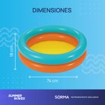Marca: Summer Waves Modelo: K90321000 Capacidad de agua: 36.5 L Forma: Redonda Materiales: PVC Edad mínima recomendada 1 meses Color Celeste/Amarillo/Naranja Dimensiones Largo x Ancho 74 m x 18 m Accesorios incluidos Parches de reparación