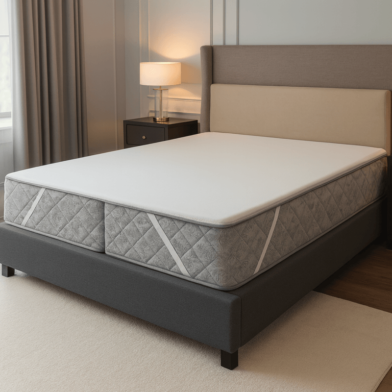 Se coloca directamente sobre ambos colchones —sin importar la marca— y queda firmemente sujeto gracias a las bandas elásticas en las esquinas y la base antideslizante, que evita desplazamientos durante el descanso.