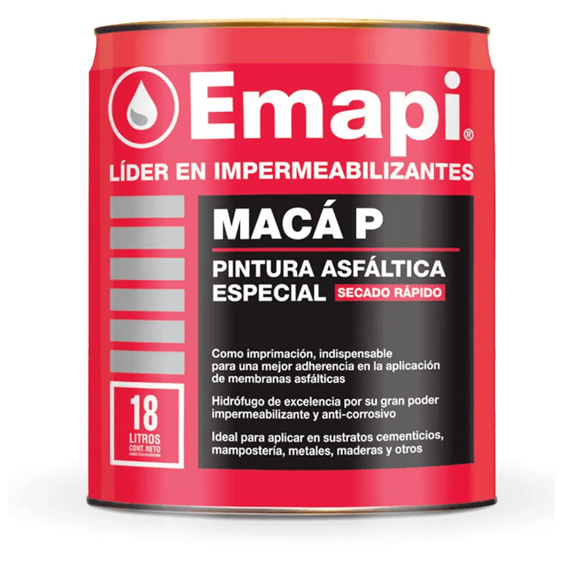 La pintura Macá P está desarrollada sobre una base de asfaltos oxidados, lo que le otorga dos propiedades únicas: facilita y asegura la correcta adherencia entre las membranas asfálticas y sus sustratos de aplicación, y protege contra la humedad gracias a sus propiedades hidrófugas y anticorrosivas.