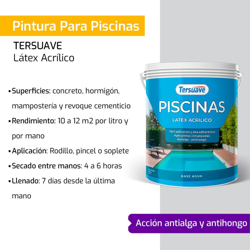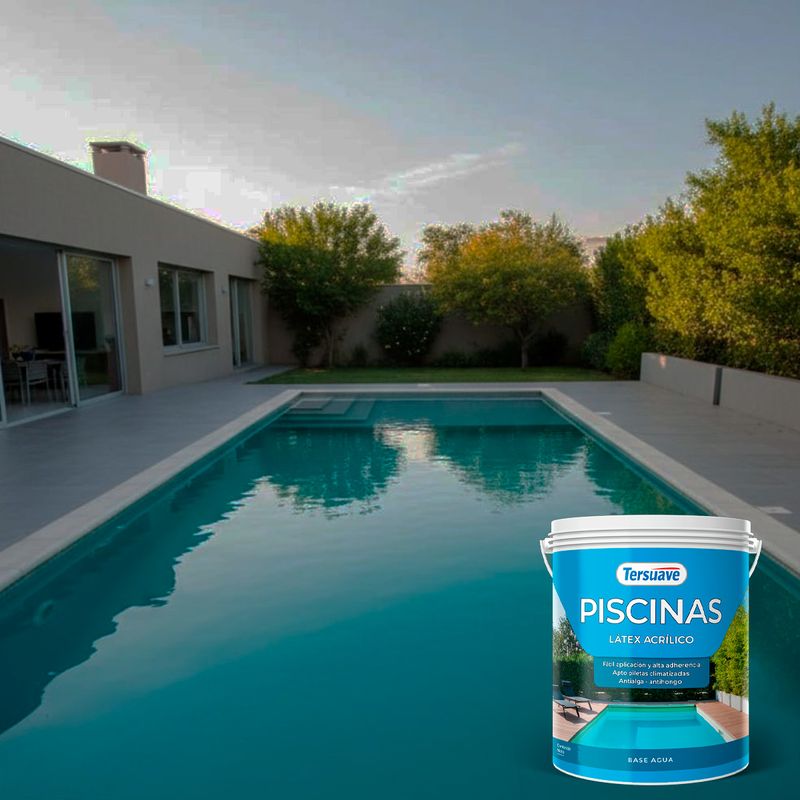 Tersuave Piscinas Látex Acrílico, es un producto desarrollado para piletas de natación de fácil aplicación y alta adherencia. Su formulación base agua de alta resistencia genera una película de gran impermeabilidad. Posee aditivos que evitan la adherencia de algas y hongos, además es de rápido secado y bajo olor. Su pigmentación de alta calidad garantiza la firmeza del color a lo largo del tiempo. Apto piletas climatizadas.