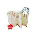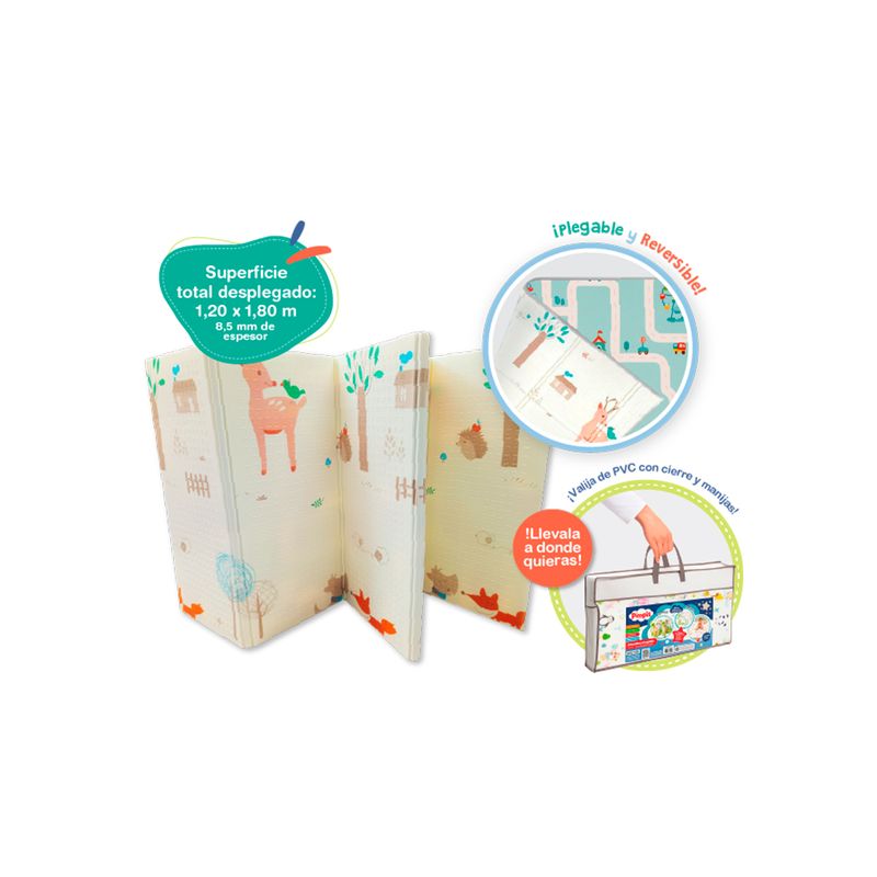 Alfombra acolchada, plegable y reversible, antigolpes, aislantes térmicos. Fácil de limpiar. En valija de PVC con cierre y manijas.
