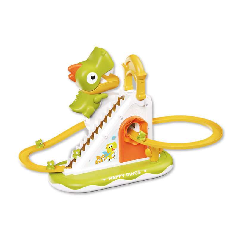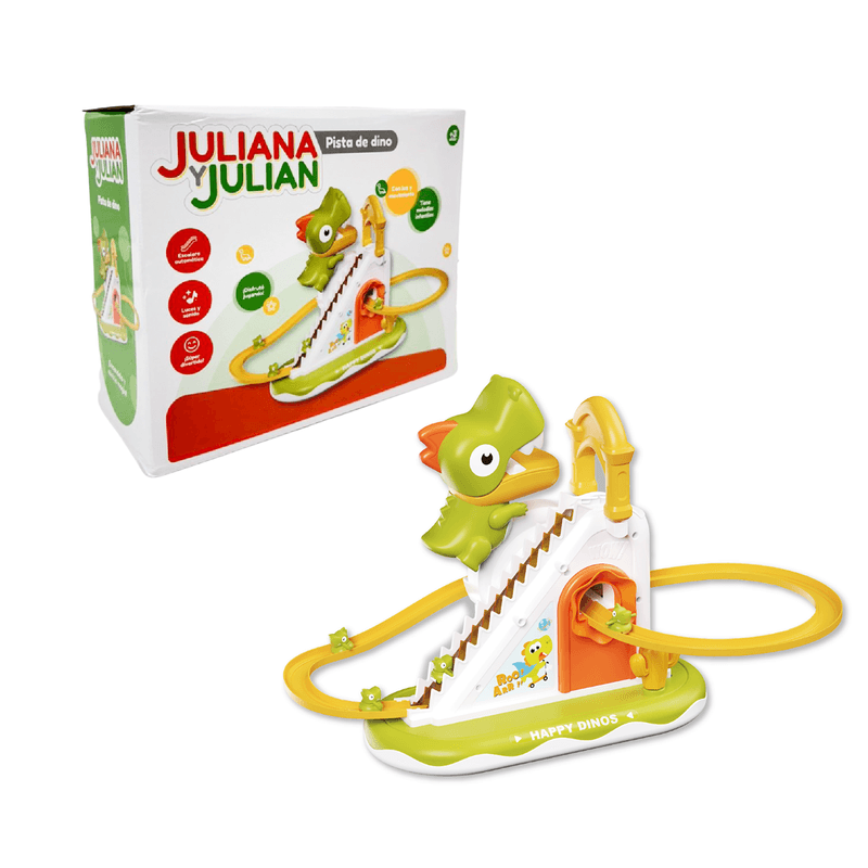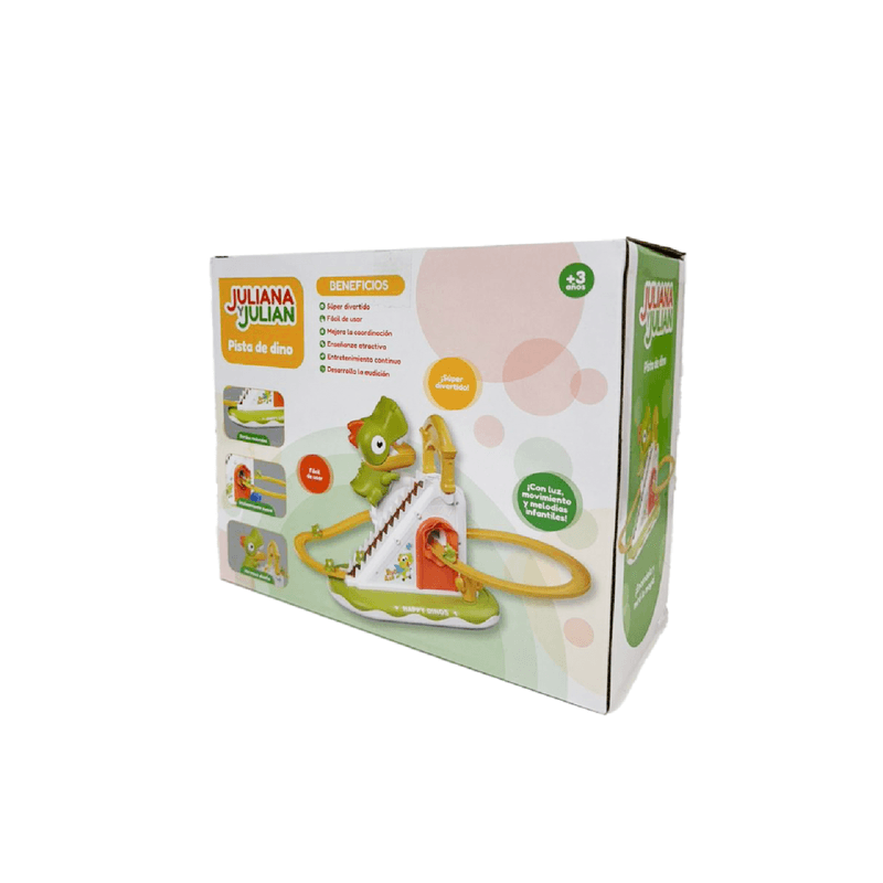 ¡La aventura nunca se detiene con la Pista de Dino de Juliana y Julián! Este divertido juguete de movimiento continuo es perfecto para los más pequeños. Los pequeños dinosaurios suben por la escalera y se deslizan suavemente por la pista una y otra vez, creando un espectáculo lleno de acción. Además, incorpora luz, movimiento y alegres melodías infantiles que capturan la atención del bebé y fomentan el desarrollo de la audición y la coordinación. Con bordes redondeados para mayor seguridad, este juguete es fácil de usar y garantiza entretenimiento sin fin. Requiere 2 pilas AA (NO INCLUIDAS).