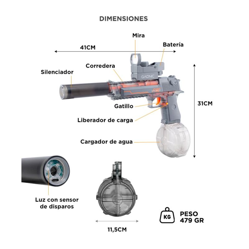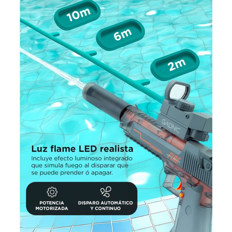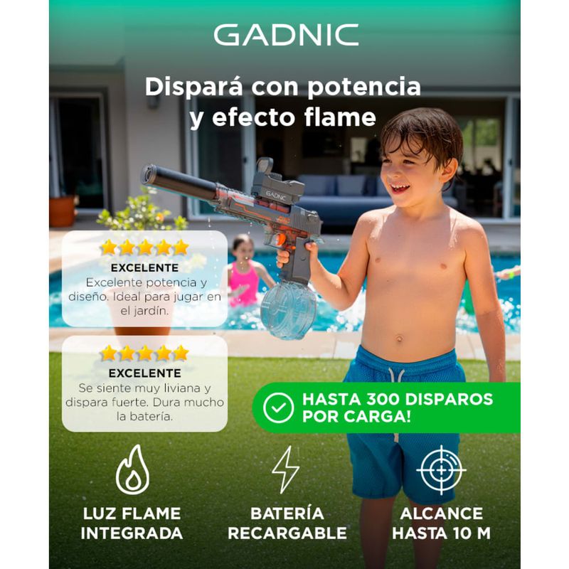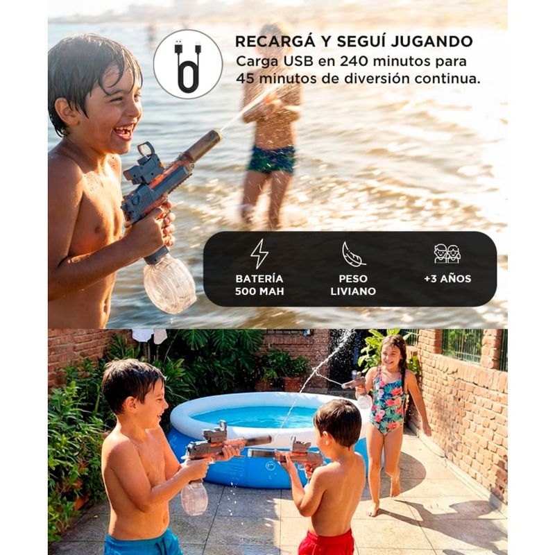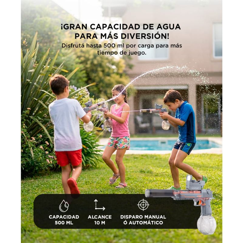 Ideal para juegos en patios, piletas o parques, con potencia precisa y segura.