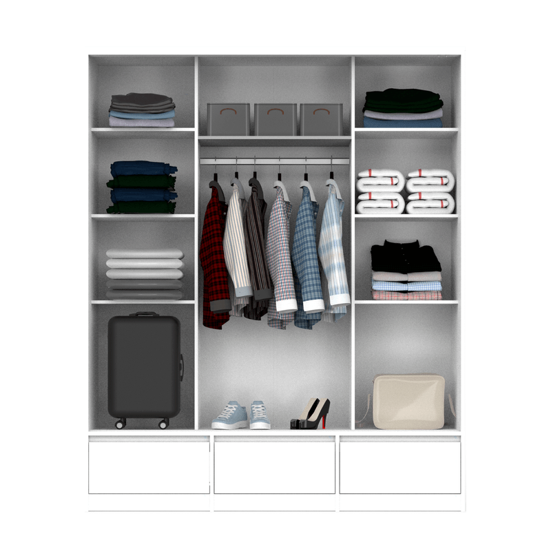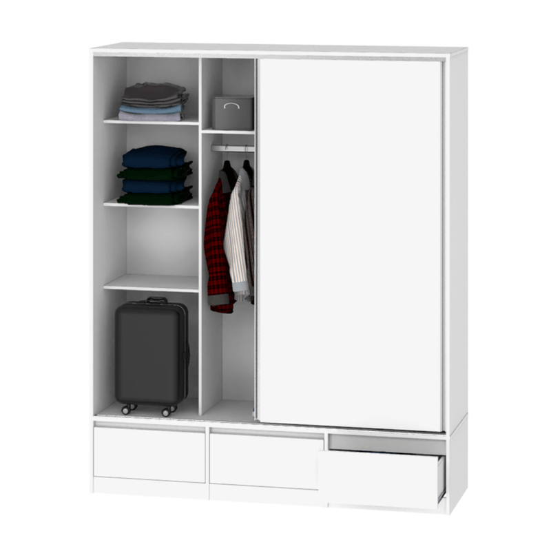 El producto cuenta con 3 cajones externos en la parte inferior, estantes para guardado y barral para colgar ropa y accesorios.