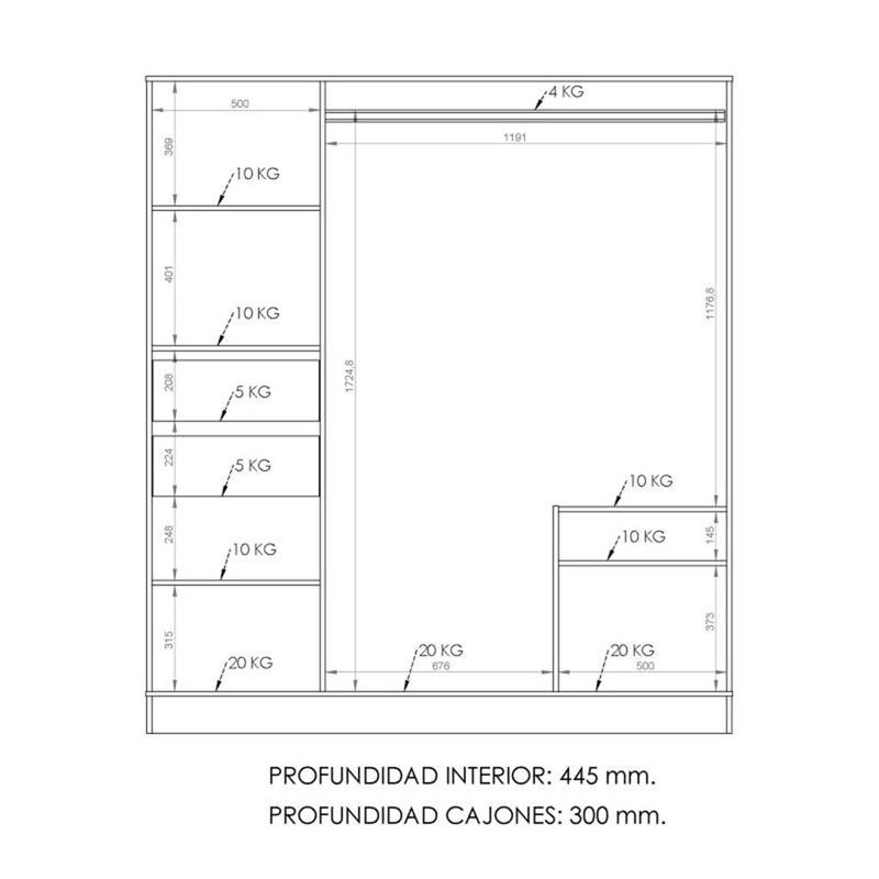 El placard clásico con 2 puertas corredizas ofrece un diseño elegante y funcional, resaltado por sus líneas rectas. Las puertas corredizas están equipadas con herrajes de última tecnología que aseguran un desplazamiento suave. En su interior, dispone de estantes, cajones y un amplio perchero para mantener todo organizado.