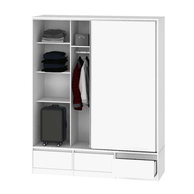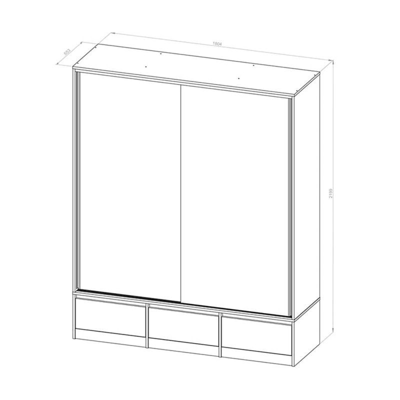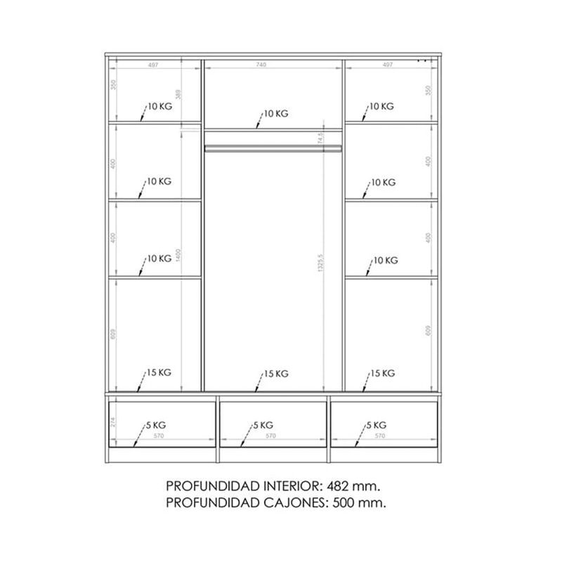 Diseño minimalista y funcional con 1,80 m de ancho y 2,20 de alto. Cuenta con 3 cajones externos, estantes y barral para colgar ropa. Perfecto para mantener tu espacio ordenado y moderno.