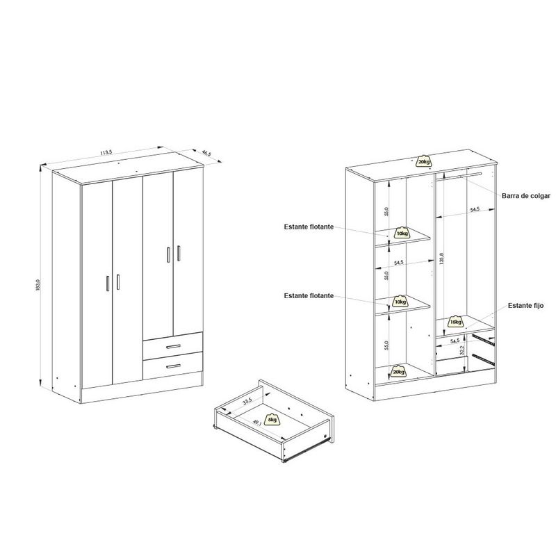 - Dimensiones: 113,5 × 183 × 46,5 cm