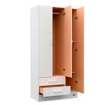 Placard Fabricado en MDP 15 mm. pintado con terminación mate. Medidas producto armado: 85x46x181 cm. 3 puertas Batientes - 2 cajones con correderas plásticas. Espacio interior de colgado con barral plástico. 2 estantes fijos y 1 regulable (1 posición). Interior del placard sin revestir. Fondo 3 mm. Manijas plásticas. Marca: Mosconi. PACKAGING: 1 BULTO Medidas: 185x59x11 cm. - Peso: 64 kg.