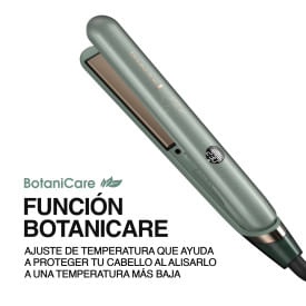 Placas recubiertas de cerámica con microacondicionador enriquecido con aloe vera, jojoba y rosa mosqueta Temperatura máxima de salón: 230 °C / 450 °F Placa flotante de 110 mm Control de temperatura digital con 10 niveles de temperatura Función Botanicare Generador de iones Calentamiento rápido de 15 segundos Apagado automático Cable giratorio de 2.7 m Cierre de seguridad Garantía de 5 años