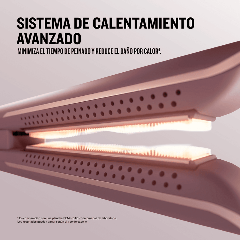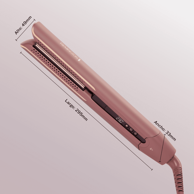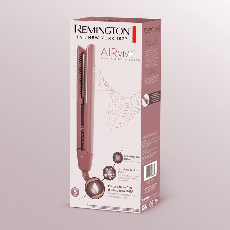 Conoce la plancha alisadora delgada REMINGTON AIRvive . Incorpora Tecnología de Aire Iónico antiestática y microacondicionadores activados por calor para brindarte un resultado 80% más suave que dura todo el día. Cuenta con cinco ajustes digitales de temperatura, que van de 150 °C a 230 °C (300 °F a 450 °F), y un sistema de calentamiento avanzado que distribuye el calor de manera uniforme a lo largo de las placas, lo que permite un alisado en una sola pasada y con menos daño por calor.