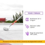 Impermeabilizante para proteger cubiertas planas o inclinadas. No aplicar en pisos terminados con llana mecánica, cerámicas semiesmaltadas o esmaltadas y asfalto.