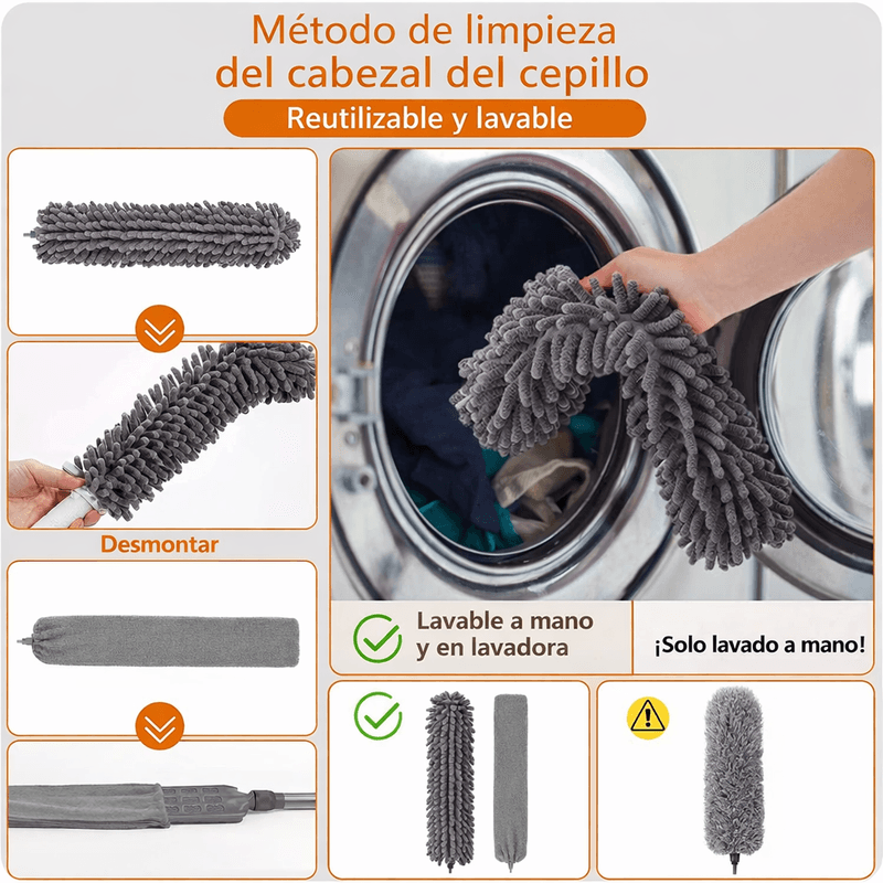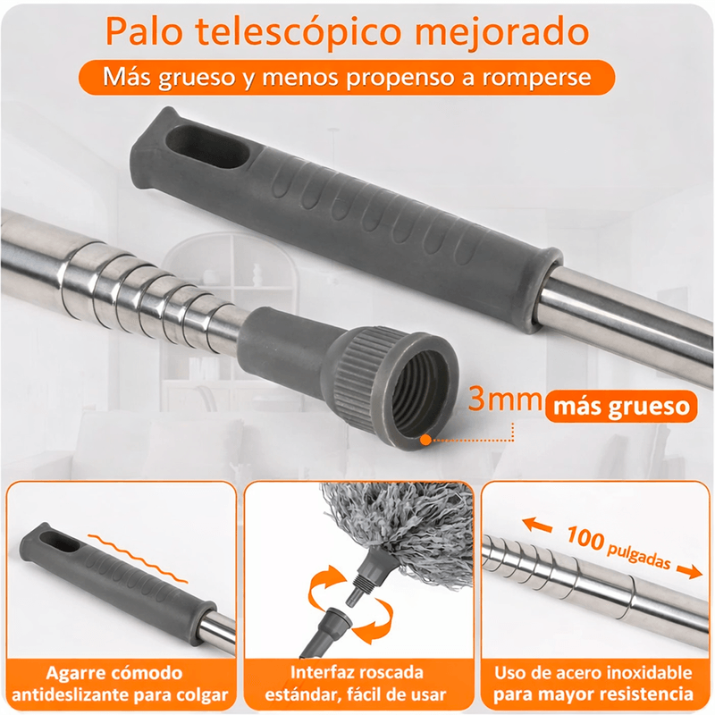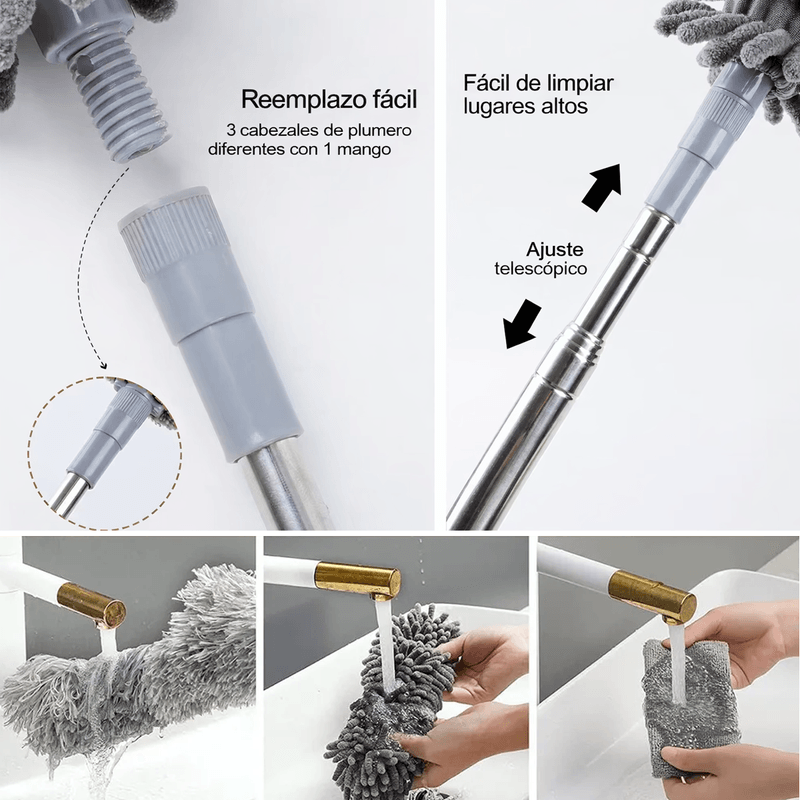 El plumero de microfibra extensible con tres cabezales intercambiables está diseñado para brindar una solución de limpieza completa, eficiente y segura en zonas altas y de difícil acceso. Su mango telescópico ajustable hasta 2,90 metros permite alcanzar techos, cortinas, aires acondicionados, ventiladores, estantes elevados y rincones sin necesidad de escaleras.
