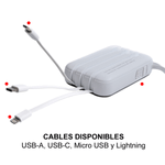 • Viene con 3 cables de carga incorporados: 1 Cable Micro USB - 1 Cable Tipo C - 1 Cable Lightning + Cable USB para cargar el power bank