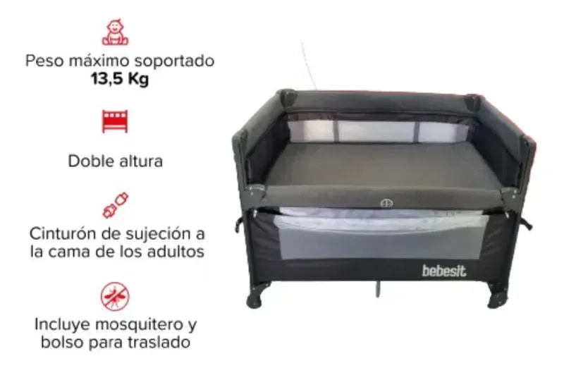 Su peso máximo soportado es de 13,5 kg, lo que lo hace apto desde el nacimiento del bebé. Además, cuenta con una baranda movible que puede ajustarse hacia arriba o abajo para facilitar el acceso al bebé.