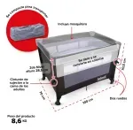 Su segundo nivel con cierre ofrece una mayor seguridad, y su mosquitero protege al bebé de insectos. La practicuna es fácil de armar y plegar, y viene con un bolso para su guardado y traslado.