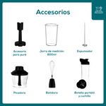• ¿Qué accesorios incluye? Incluye batidor de inmersión, picador, vaso medidor, accesorio para puré, batidor de varillas, espumador de leche y una botella deportiva con tapa.