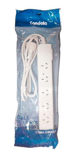 Con tecla de encendido Carcasa de plástico. Permite fijación en paredes o zócalos. 5 toma corrientes. Longitud del cable 1,5 mts. Ficha IRAM: 2073. Tensión máxima: 250V. Carga máxima simultanea: 10A. Frecuencia: 50Hz. Garantía de fábrica 3 Meses