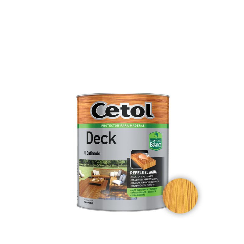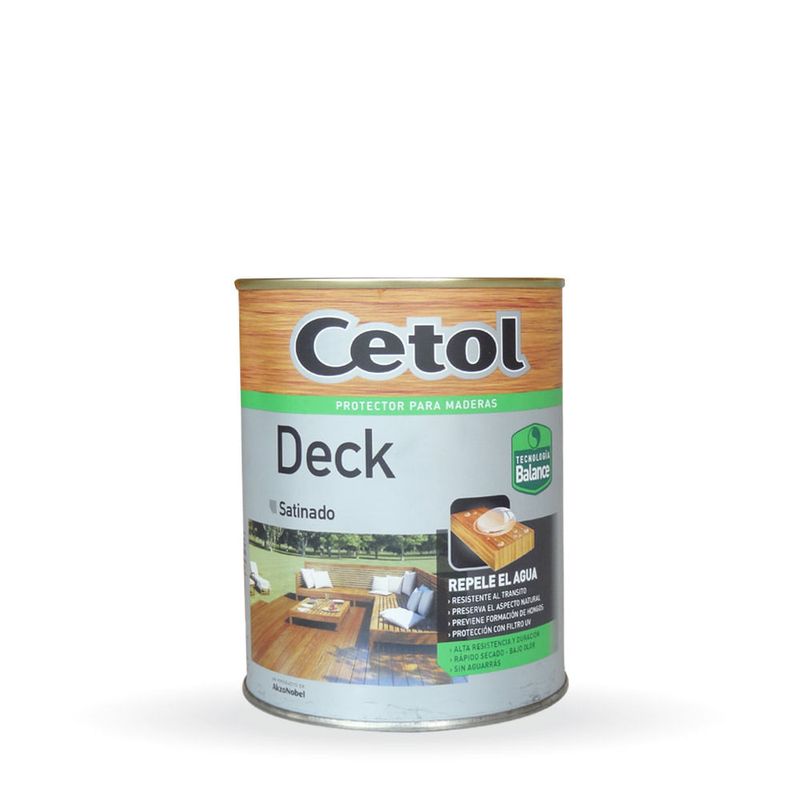 PROTECTOR PARA MADERAS CETOL DECK BALANCE - AKZO NOBEl se diferencia de barnices y productos usados tradicionalmente en las maderas por no ampollarse, descascararse ni cuartearse. La tecnología Balance ofrece una alta performance que, de forma práctica, con su bajo olor, ausencia de aguarrás y rápido secado hace las cosas más fáciles. Su película microporosa con aditivos especiales, permite que Cetol penetre profundamente en la madera, dejando que respire su propia humedad y al mismo tiempo deja la superficie totalmente impermeable a la lluvia. Es ideal para exteriores, evitando la formación de algas y hongos.