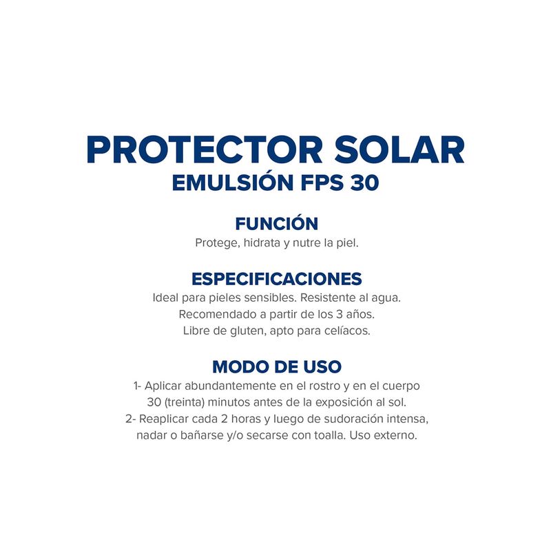 PROTECTOR SOLAR con FPS 30. Alta protección contra las quemaduras solares, dejando una agradable sensación en la piel.