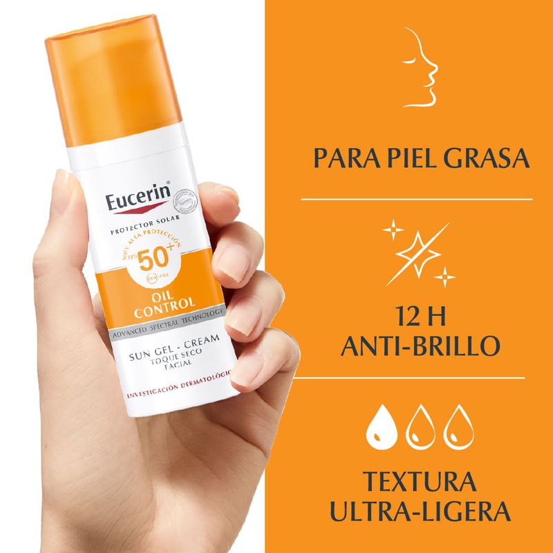 El Protector solar Eucerin Oil Control Toque Seco con Advanced Spectral Technology está diseñado para las necesidades específicas de la piel grasa y propensa al acné. Esta crema para el rostro proporciona protección de nivel superior contra los daños de la piel incluidos por el sol, ayuda a prevenir el fotoenvejecimiento y contiene una solución activa para mejorar el estado de la piel. Su fórmula contiene Licochalcona A, Ácido Glicirretínico y Carnitina para darle a la piel un acabado mate seco, inmediato y duradero por ocho horas. Además, posee un sistema de filtros solares UVA/UVB fotoestable, FPS 50+ y pigmentos de color que unificar el tono de la piel.
