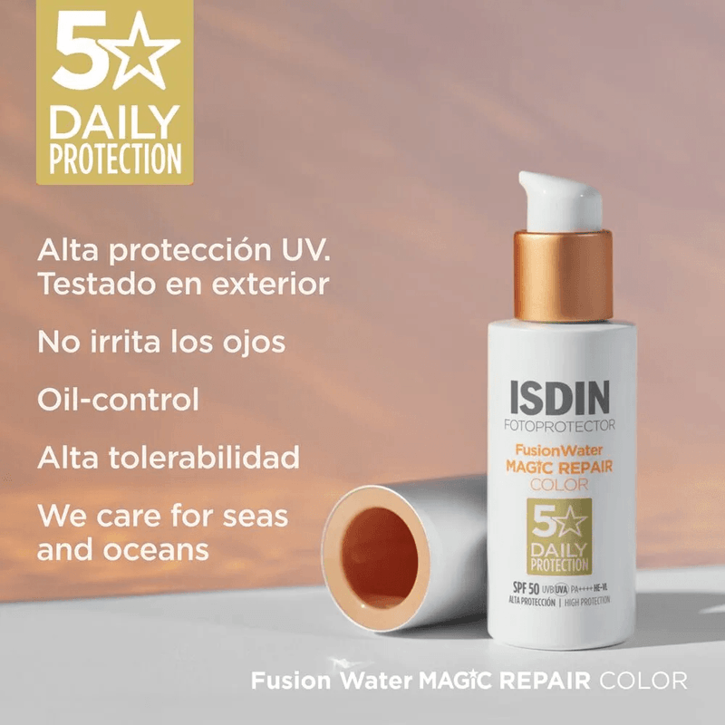Protección solar facial con color, ultraligera y de uso diario con triple acción antifotoenvejecimiento. Aporta una cobertura natural que unifica el tono y disimula imperfecciones, proporcionando un efecto buena cara. No comedogénico, oil-free e hipoalergénico.