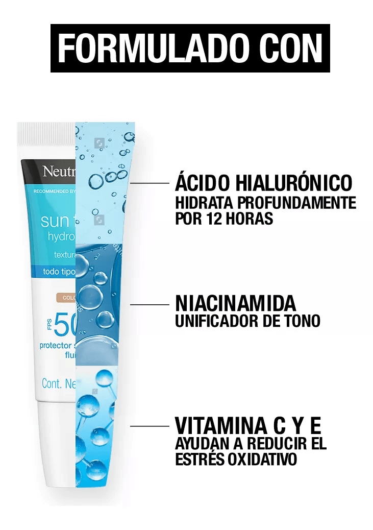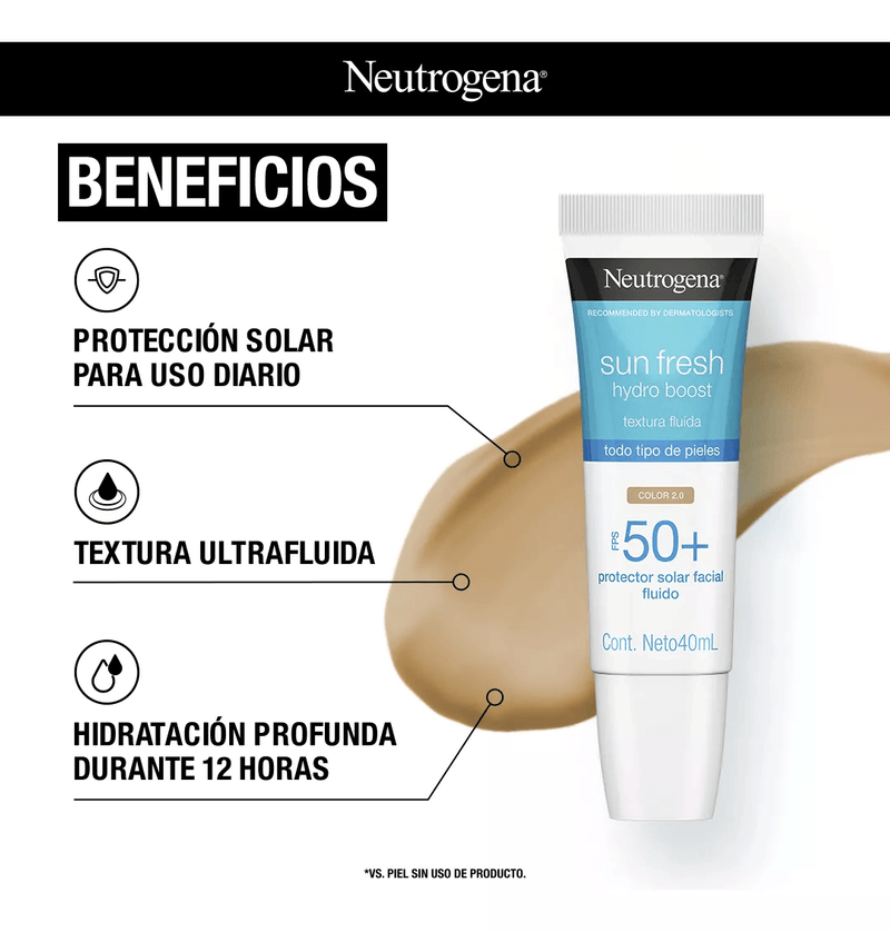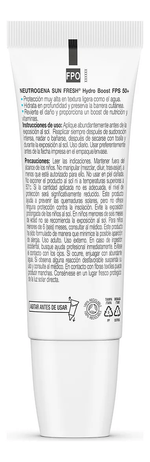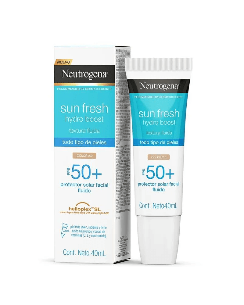 NEUTROGENA SUN FRESH® Hydro Boost FPS 50+ Tono Claro: Con una textura fluida para todo tipo de piel. Su exclusiva tecnología HELIOPLEX™ SL ofrece una protección muy alta, formando una barrera protectora contra los rayos UV, la luz visible y la polución. Proporciona un boost de hidratación y vitaminas, para revertir los daños causados por el sol y preservar la vitalidad de la piel. Con Ácido Hialurónico, que hidrata profundamente durante 12 horas*. Niacinamida: un activo aclarador de las manchas causadas por el sol; Vitamina C y E: que funcionan como antioxidantes para la piel.