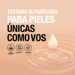Con una textura fluida para todo tipo de piel. Su exclusiva tecnología HELIOPLEX™ SL ofrece una protección muy alta, formando una barrera protectora contra los rayos UV, la luz visible y la polución. Proporciona un boost de hidratación y vitaminas, para revertir los daños causados por el sol y preservar la vitalidad de la piel. Con Ácido Hialurónico, que hidrata profundamente durante 12 horas*. Niacinamida: un activo aclarador de las manchas causadas por el sol; Vitamina C y E: que funcionan como antioxidantes para la piel.