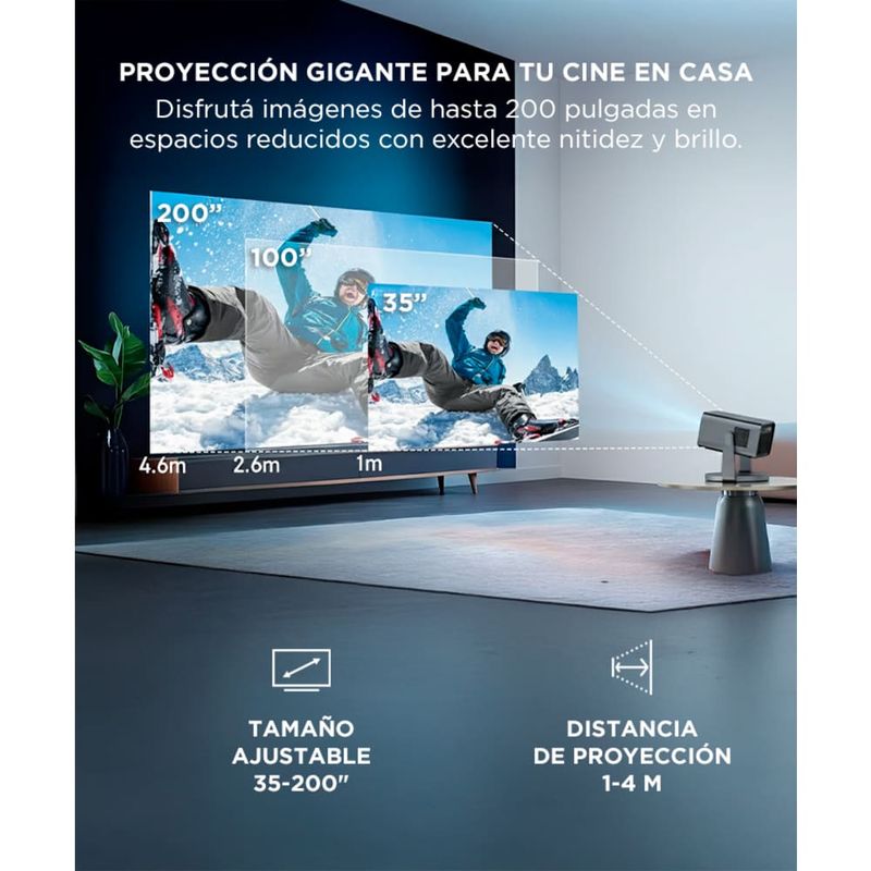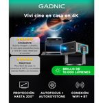 El Proyector Gadnic C30B ofrece resolución nativa 4k, ideal para disfrutar películas, series y presentaciones con buena definición. Su rango de tamaño proyectado de 35 a 200 pulgadas permite crear desde un cine en dormitorio hasta una pantalla grande en el living u oficina.