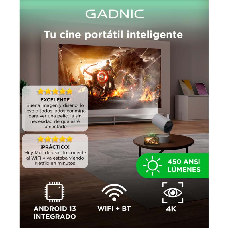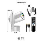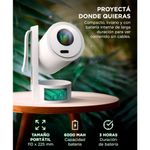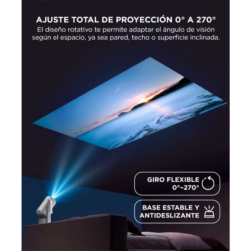 Con su batería interna de 6000 mAh, disfrutá hasta 3 horas de reproducción continua sin enchufes. Sus dimensiones de 110 x 110 x 225 mm y el diseño cilíndrico con base giratoria 270° permiten proyectar en cualquier dirección, incluso en el techo.