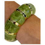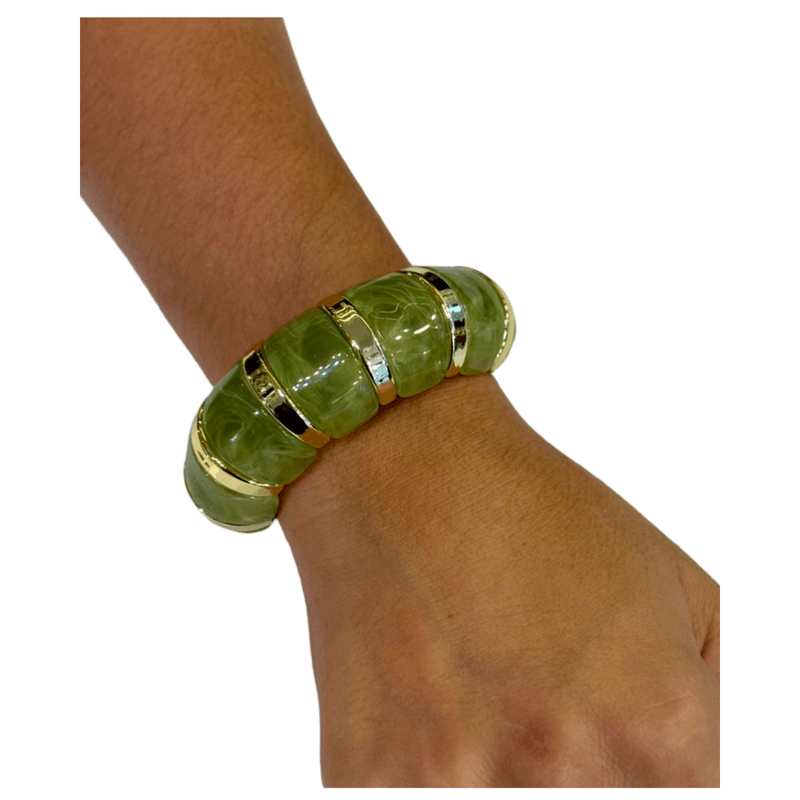 La Pulsera Vera es una pieza moderna y elegante que destaca por su diseño voluminoso y sus tonos vibrantes.