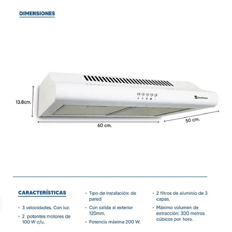 -Tres velocidades ajustables: Controla la intensidad de extracción según tus necesidades, para eliminar humo, olores y vapores de forma rápida y eficiente.