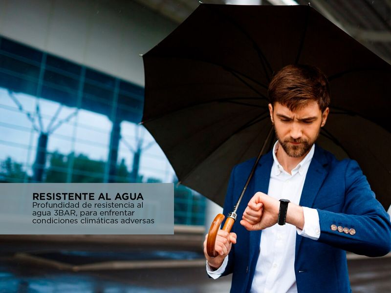 Diseñado para soportar salpicaduras y resistir la inmersión ocasional, este reloj es perfecto para la vida cotidiana. Con una resistencia de hasta 3 bar de profundidad. Sin embargo, se recomienda no sumergir.