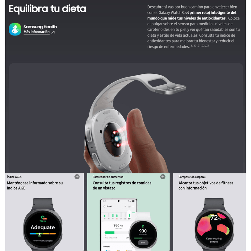 Sensores: BioActive (frecuencia cardíaca, ECG, BIA), acelerómetro, giroscopio, barómetro, luz ambiental, brújula, termómetro infrarrojo