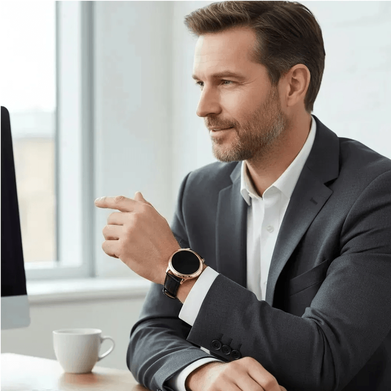 Descubre el Reloj Smartwatch Inteligente Noga SW25 BT, una fusión perfecta de estilo y funcionalidad. Con su elegante diseño en color negro y malla de cuero, este smartwatch se adapta a cualquier ocasión, desde una reunión de trabajo hasta una salida casual. Su pantalla AMOLED ofrece una visualización nítida y vibrante, asegurando que cada notificación y cada dato sean fácilmente legibles.