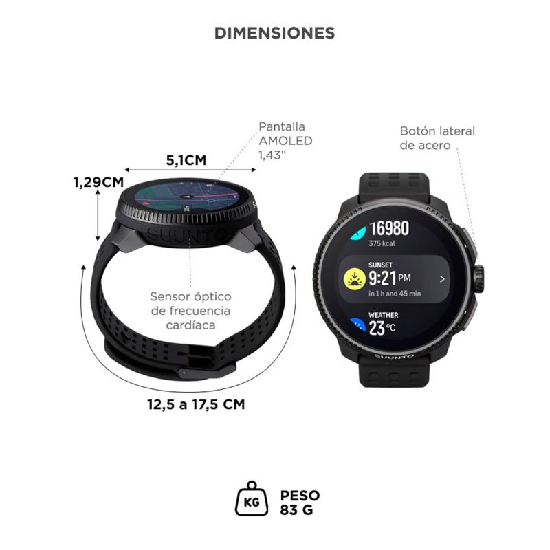 El Suunto Race All Black es un reloj deportivo de alto rendimiento pensado para quienes viven con intensidad cada kilómetro, cada ascenso y cada segundo de esfuerzo. Su pantalla AMOLED brillante de 1,43?, combinada con materiales premium como acero inoxidable y cristal de zafiro, ofrece una experiencia de uso clara y resistente.