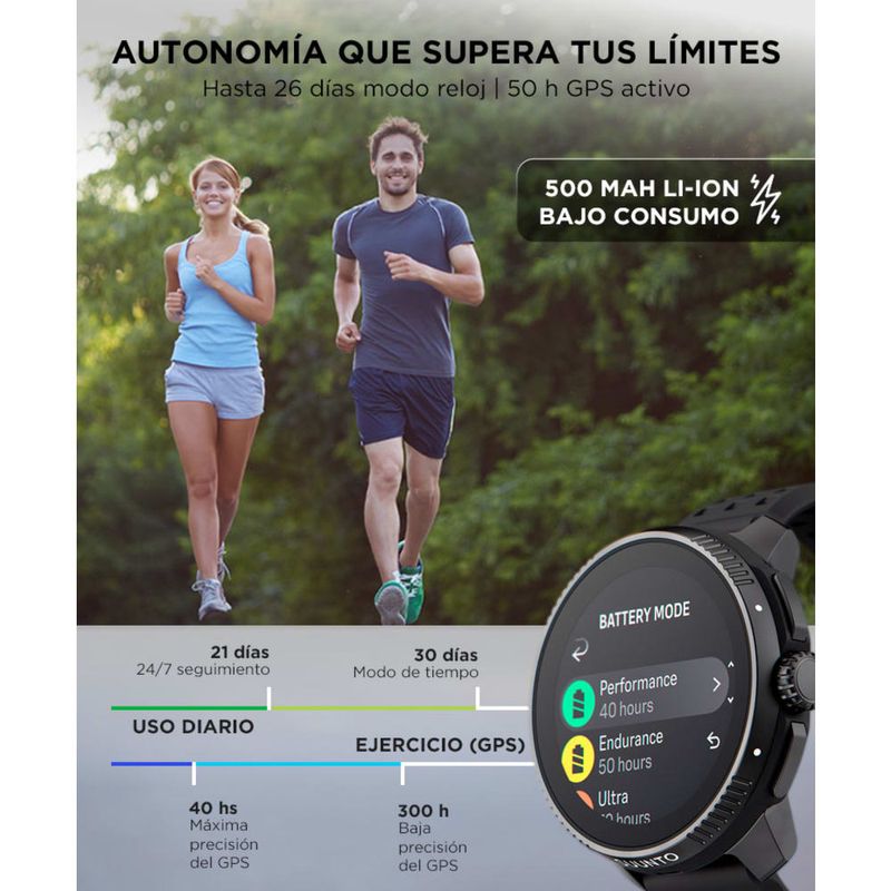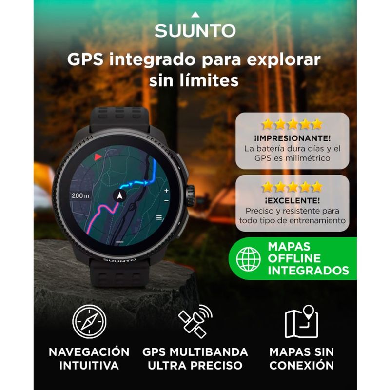 Con más de 95 modos deportivos, mapas sin conexión, GPS multibanda y análisis avanzado de carga y recuperación mediante HRV y Suunto Coach, este reloj te permite planificar, ejecutar y revisar tus entrenamientos con precisión. También está preparado para la aventura gracias a su resistencia al agua hasta 100 m y su construcción robusta según estándares militares.