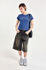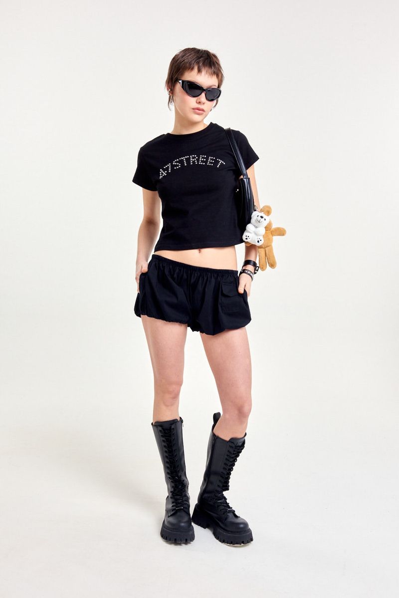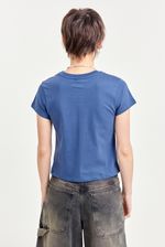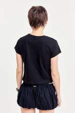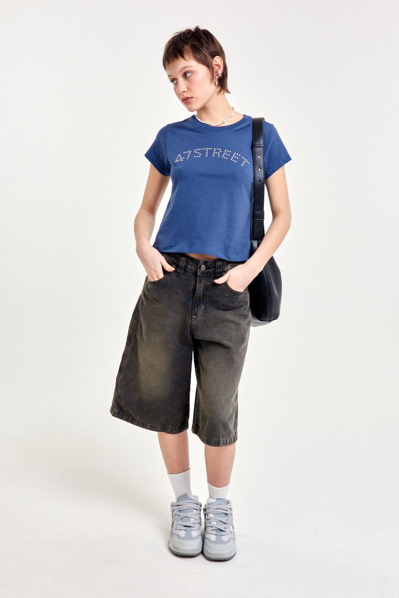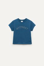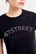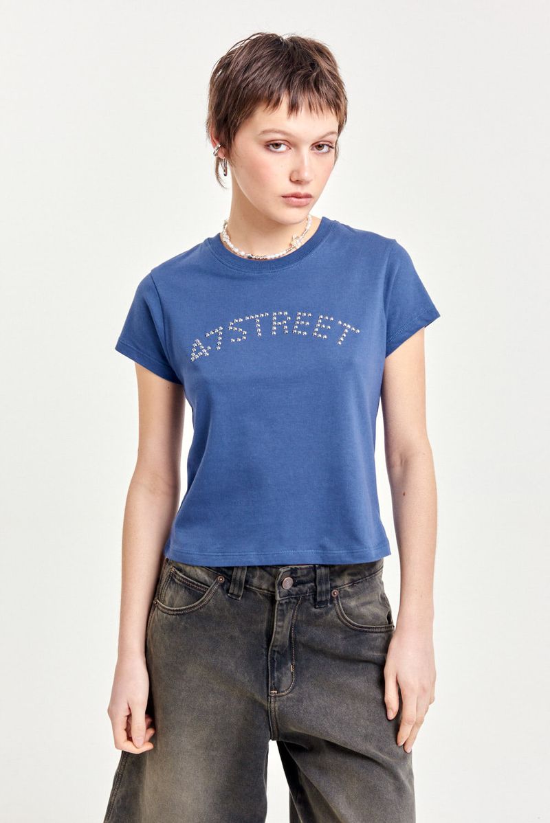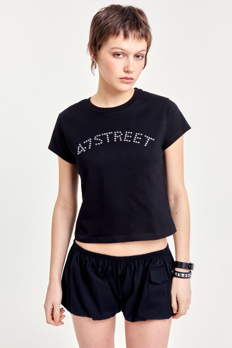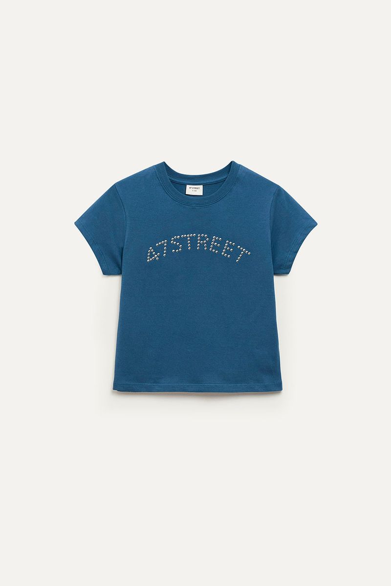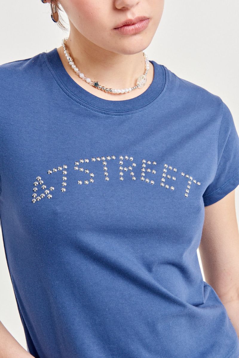Remera de algodón 100% con mangas cortas y calce regular a la cintura. Lleva cuello redondo con terminación en ribb y un aplique metálico de tachas hotfix en el frente que le da un toque distinto. Ideal para combinar con jeans, minis o pantalones cargo para un look único y con personalidad.