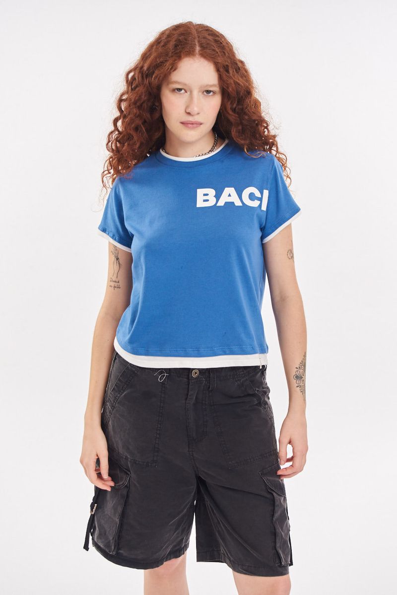 Remera de jersey 30/1 manga corta, simulando tener una remera abajo, con zocalo en ruedo y mangas a contratono. Estampa en el frente y espalda. Grifa institucional.