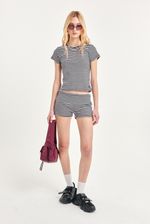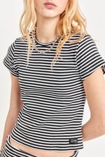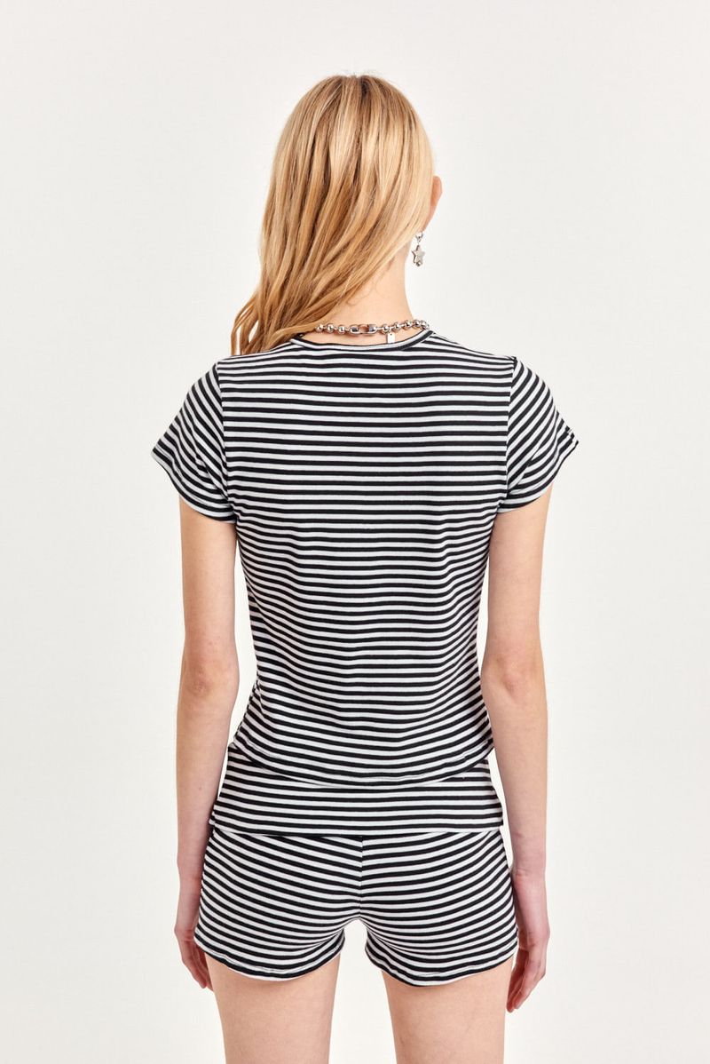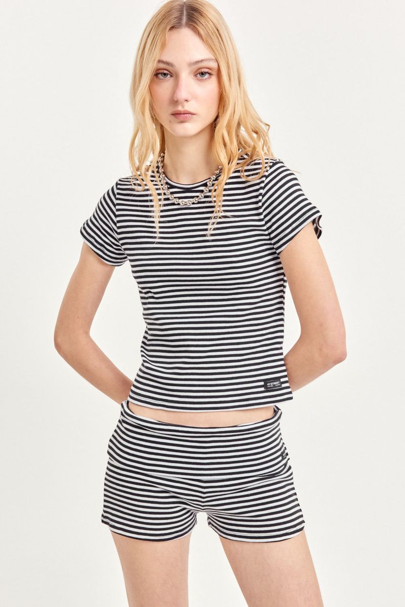 Remera manga corta de ribb con cuello en la misma tela y etiqueta tejida sobre el ruedo. Cómoda y versátil, con diseño a rayas que nunca falla. Perfecta para combinar con jeans flare o shorts lisos para balancear el look.
