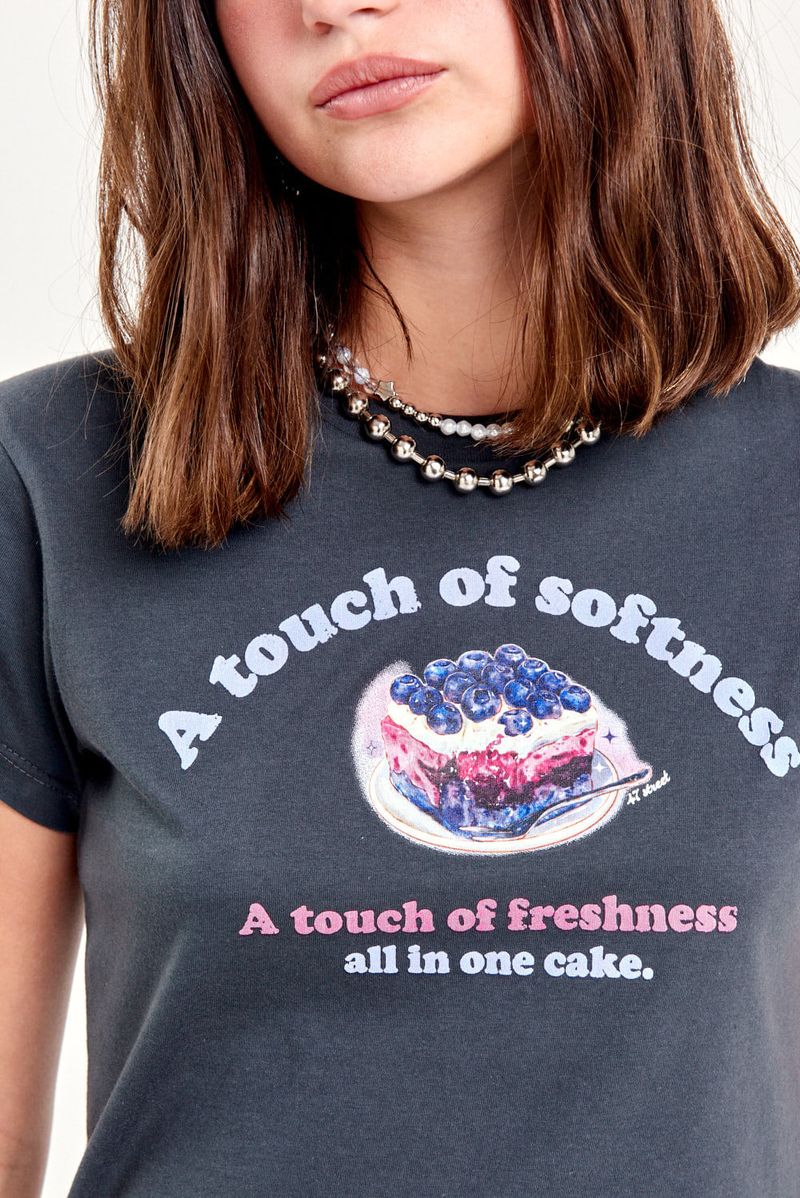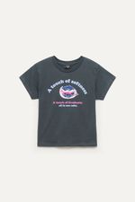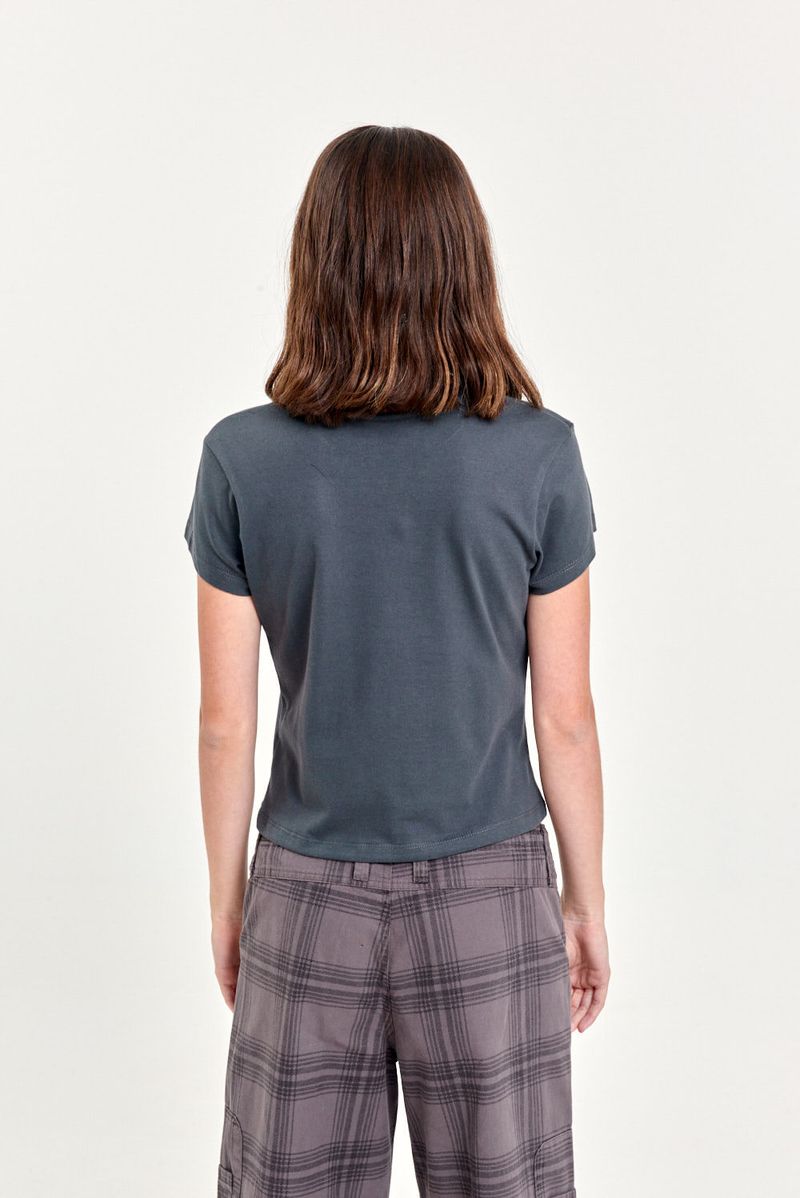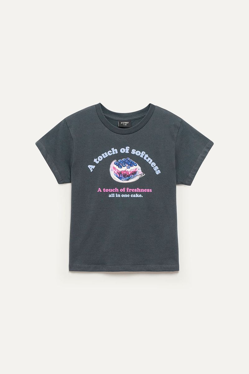 Remera de manga corta en jersey de algodón, con cuello aplicado en ribb y estampa al frente. Largo a la cintura, ideal para un estilo casual con un toque divertido. Match con jeans wide leg y zapatillas clásicas para un look fresco y descontracturado.