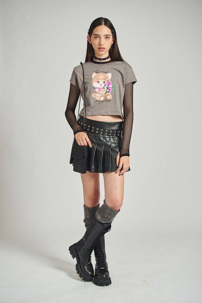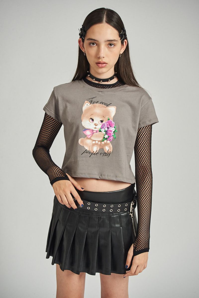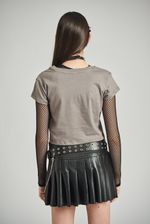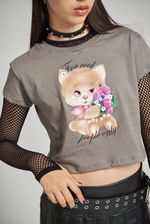 Remera manga corta de jersey 30/1 con cuello aplicado de ribb. Cuello redondo. Estampa centrada en frente. Largo por debajo de la cintura.