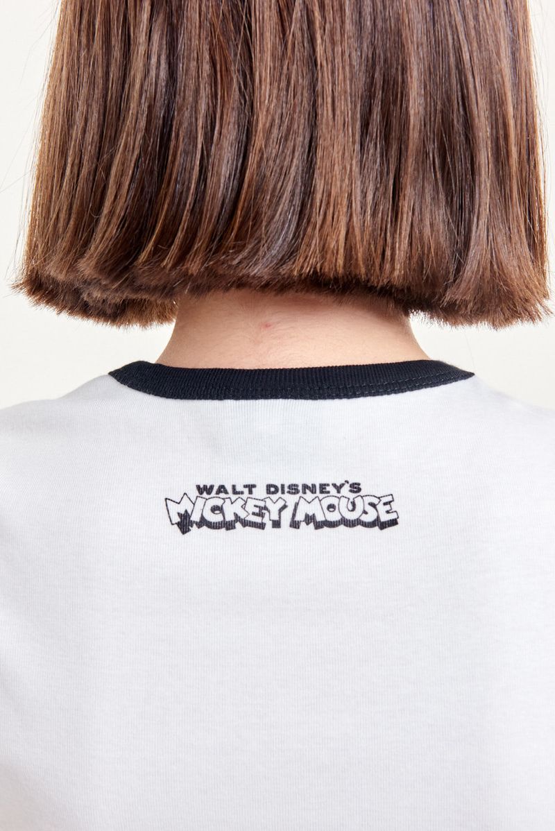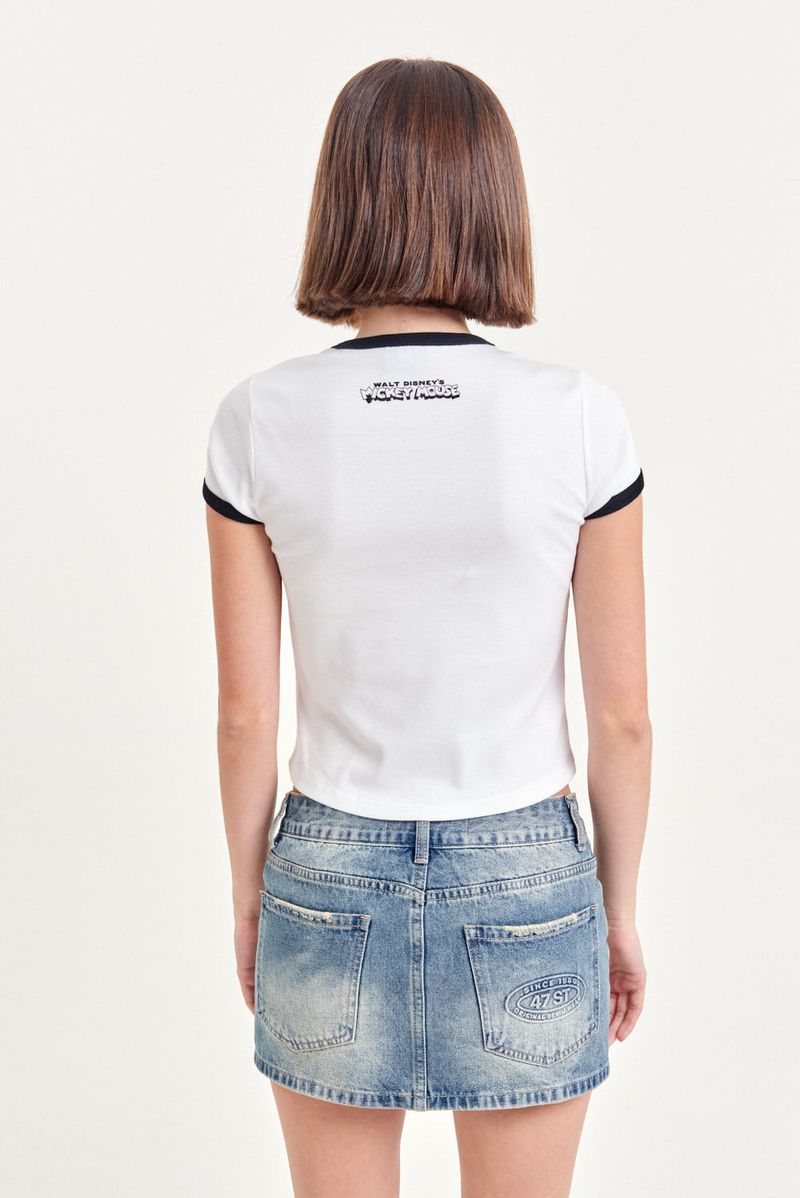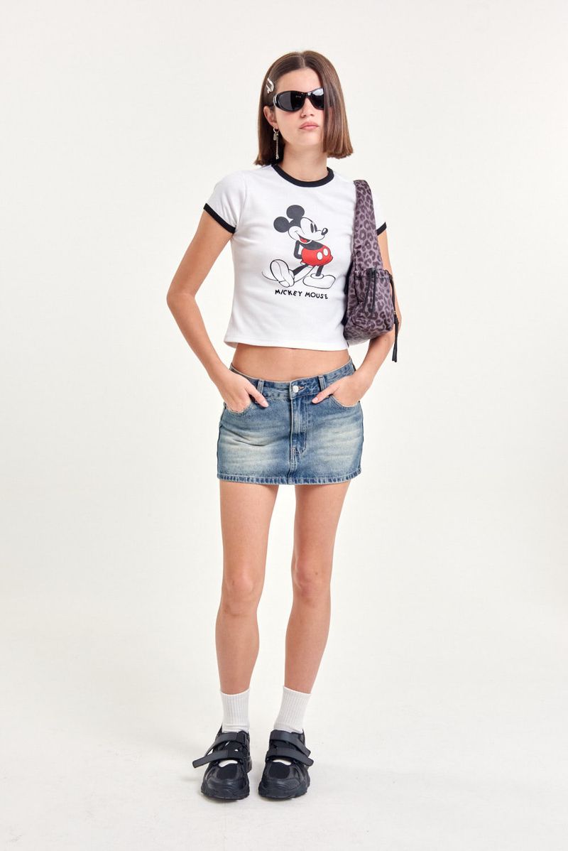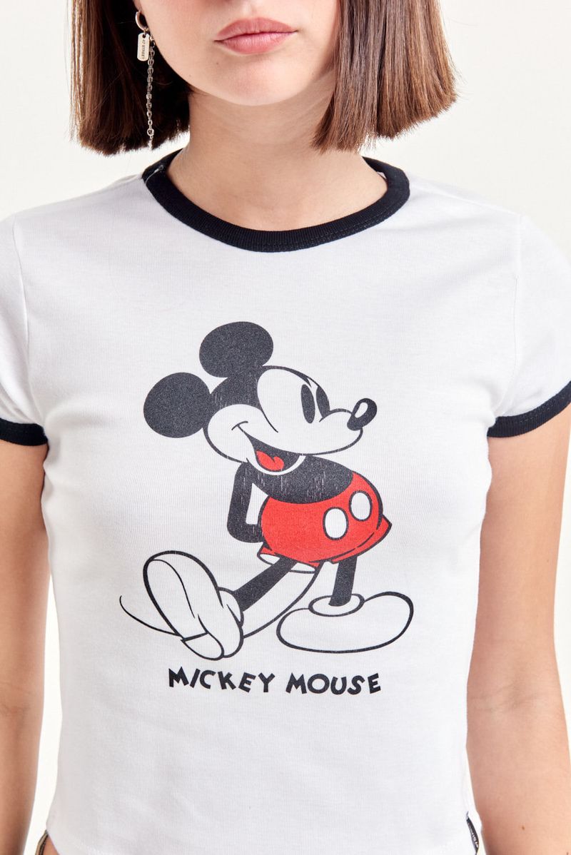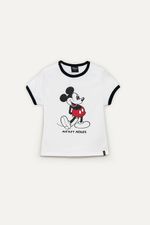 Remera de ribb con vivos en cuello y mangas a contratono, calce slim. Estampa de Mickey en frente y espalda, más grifa institucional en el ruedo. Perfecta para usar con jeans rectos o shorts de gabardina y aportar un toque divertido a tus outfits. Producto con licencia oficial de Disney.