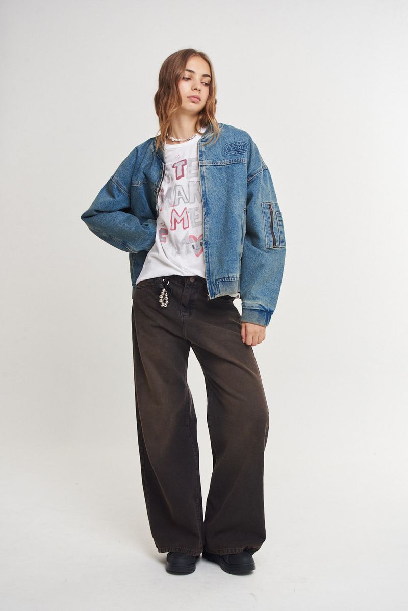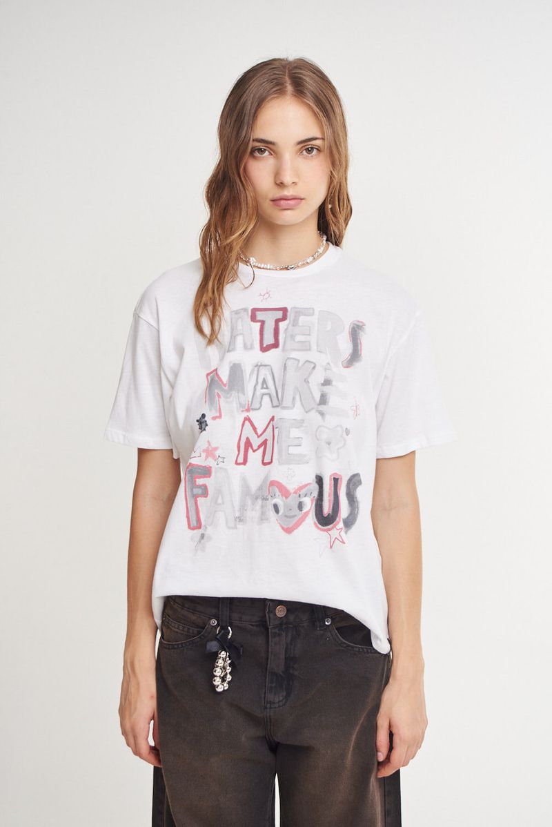 Remera manga corta de jersey, con cuello redondo. Largo hasta la cadera. Estampa en el frente.