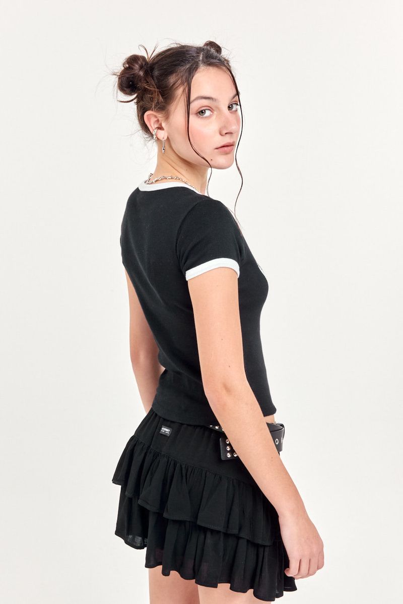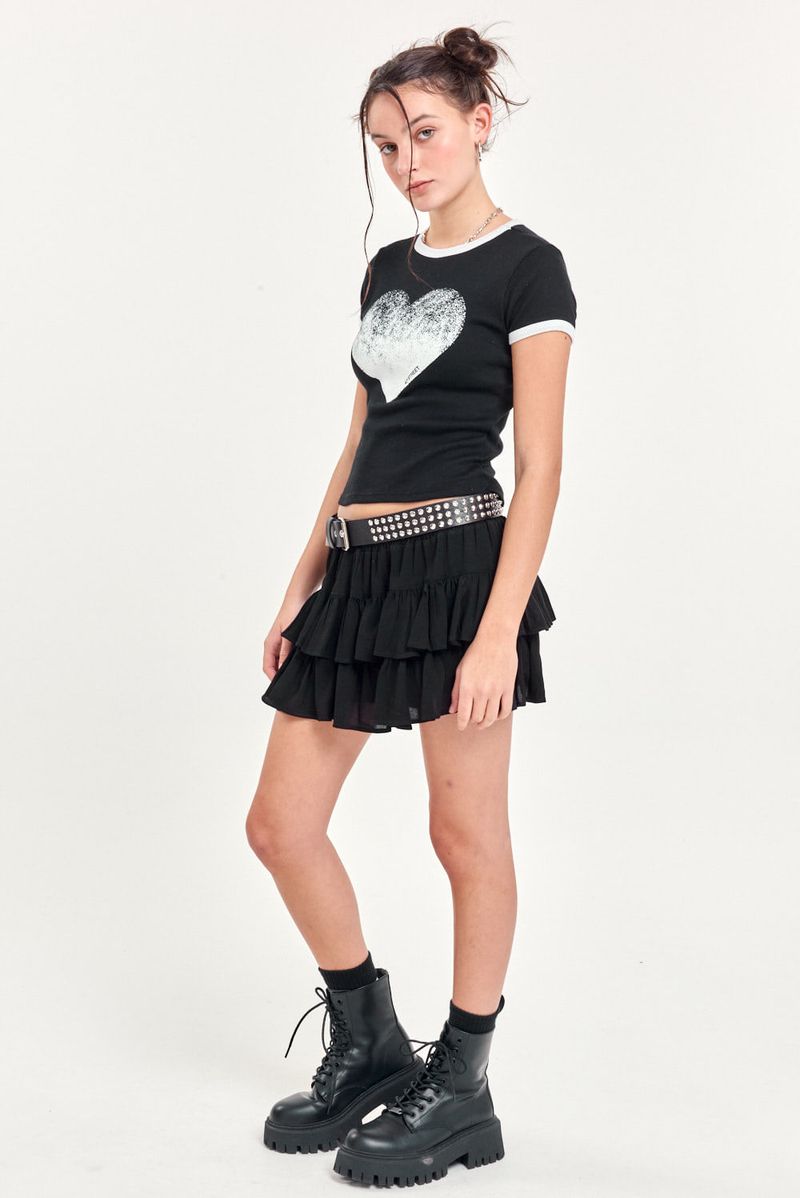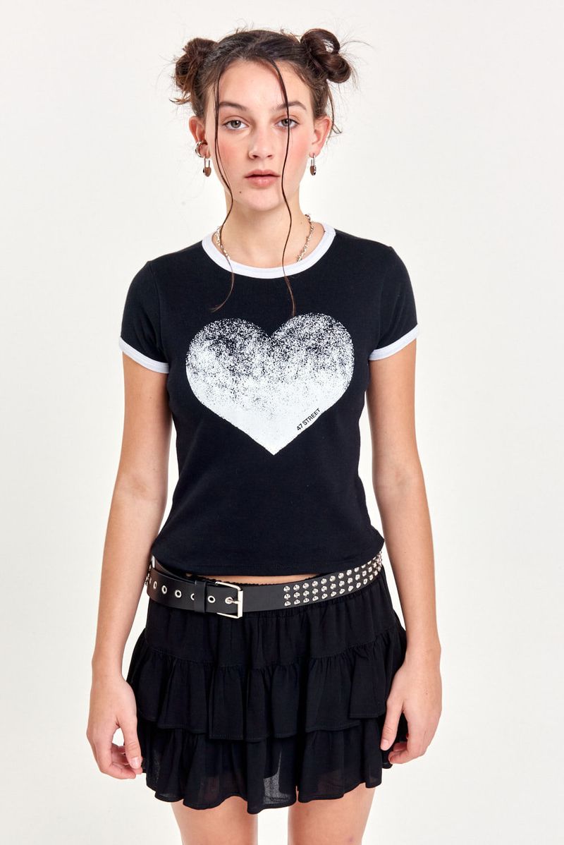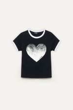 Remera de jersey con cuello redondo y detalles aplicados en contratono. Lleva una estampa frontal en forma de corazón que suma personalidad sin recargar. Corte relajado y largo clásico. Probala con faldas o pantalones amplios.