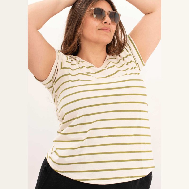 Su diseño rayado en beige y verde es un básico imprescindible que combina con todo. Estos tonos sutiles y súper delicados te irán con todo este verano!