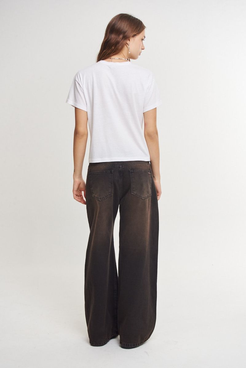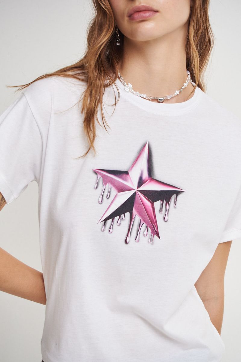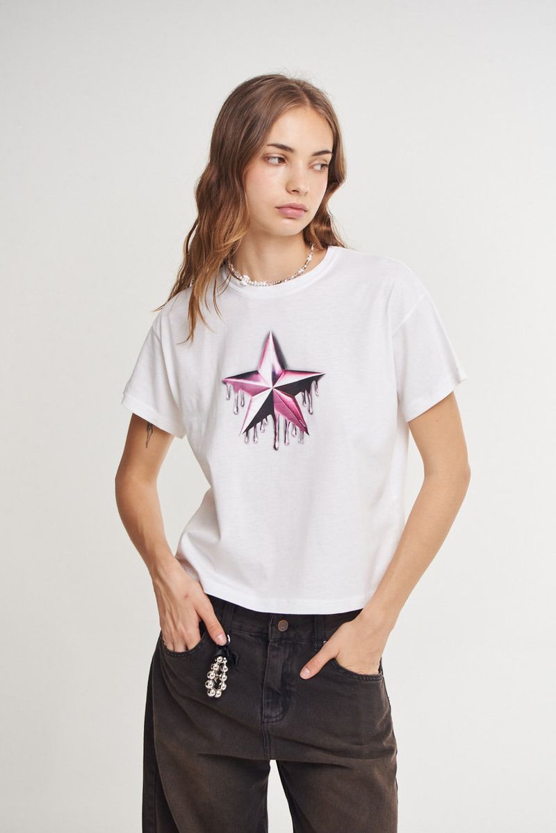 Remera básica corta de jersey liviano con cuello aplicado. Moldería boxy. Largo a la primer cadera. Estampa centrada en delantero.