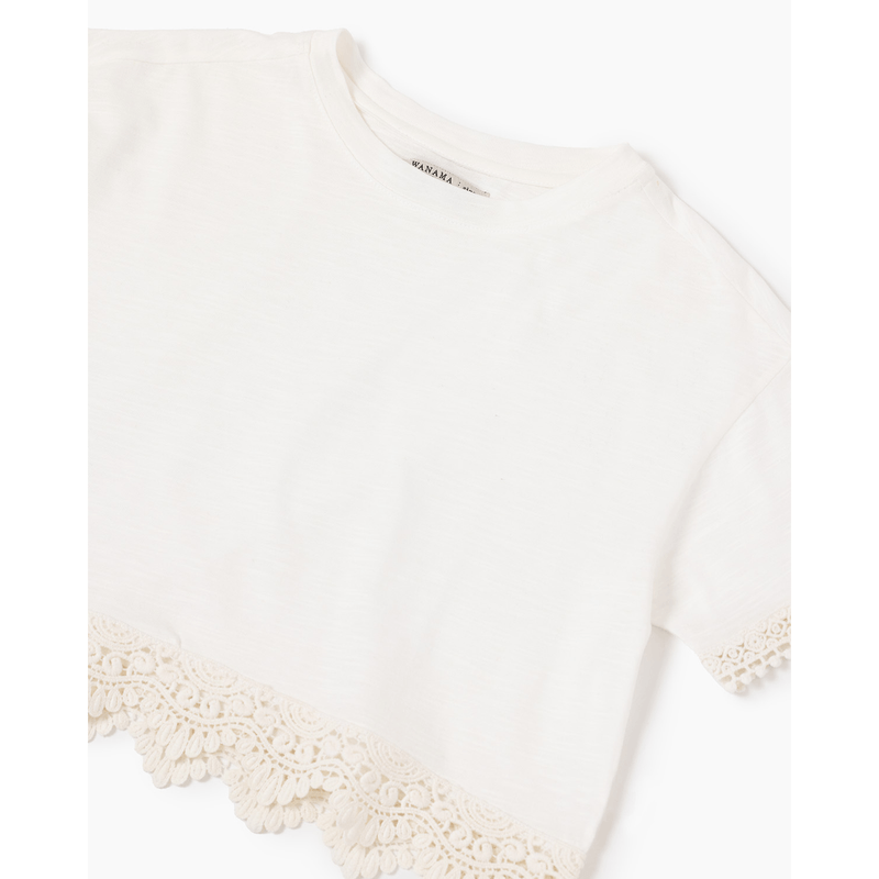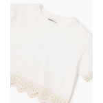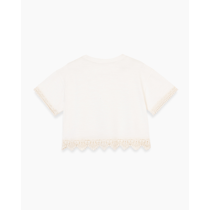 Remera over corta confeccionada en jersey flame de algodón. Posee puntillas al tono en ruedos de manga y de cuerpo. Es un ítem romántico muy canchero que queda bien con todo.
